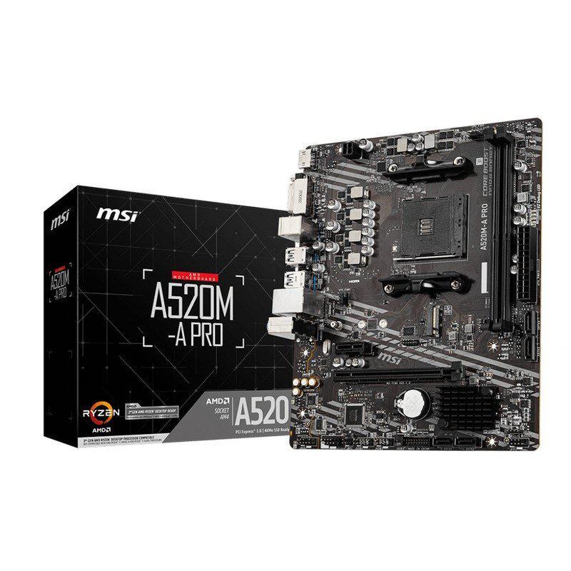 Características principales Marca MSI Modelo A520M-A PRO Color Negro Otros Plataforma AMD Chipset AMD A520 Socket AM4 Factor de forma Micro ATX Tipo de memoria RAM DDR4 Capacidad máxima soportada de la memoria RAM 64 GB Peso y dimensiones Altura 27 cm Ancho 26 cm Peso 1 kg